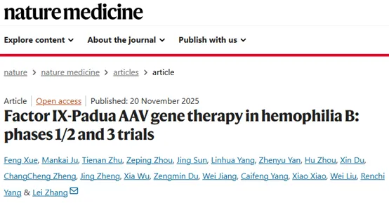 Shanghai, China, November 20, 2025 — Belief BioMed (BBM), an innovative biotechnology company focused on developing cutting-edge gene therapies, today announced that the data from the Phase 1/2 and Phase 3 (NCT05203679) clinical studies and the long-term follow-up data from the investigator-initiated trial (IIT)(NCT04135300) for BBM-H901 (generic name: Dalmacogene Ponparvovec) in adults with hemophilia B, a gene therapy drug developed and manufactured by BBM, have been published in the authoritative international journal Nature Medicine(Impact Factor: 50.0). The paper is titled "Factor IX Padua gene therapy in hemophilia B: phase 1/2 and 3 trials". This study was conducted under the leadership of Professors Lei Zhang and Renchi Yang from the Blood Disease Hospital of the Chinese Academy of Medical Sciences (Institute of Hematology, Chinese Academy of Medical Sciences).