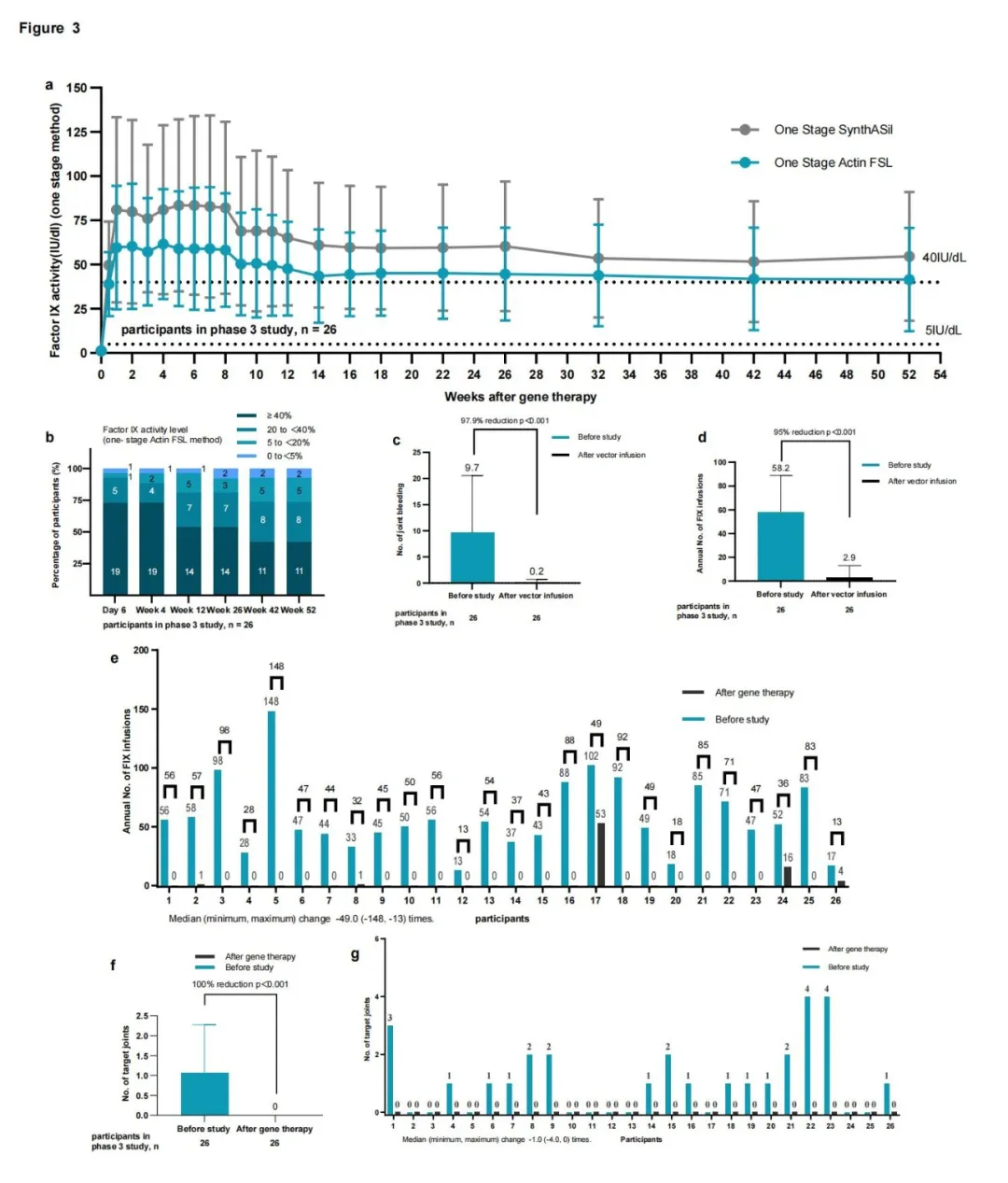 l The results of Phase 3 showed that after 52 weeks follow-up, the mean annualized bleeding rate (ABR) in participants was only 0.6 (95% CI: 0.18-1.99), with a significant decrease compared to the superiority margin, an average ABR of 5.0 for Chinese hemophilia B patients receiving prophylactic treatment. The mean FIX:C level at week 52 after gene therapy was 55.1 IU/dL (SD35.9) (OSA, SynthAsil).
